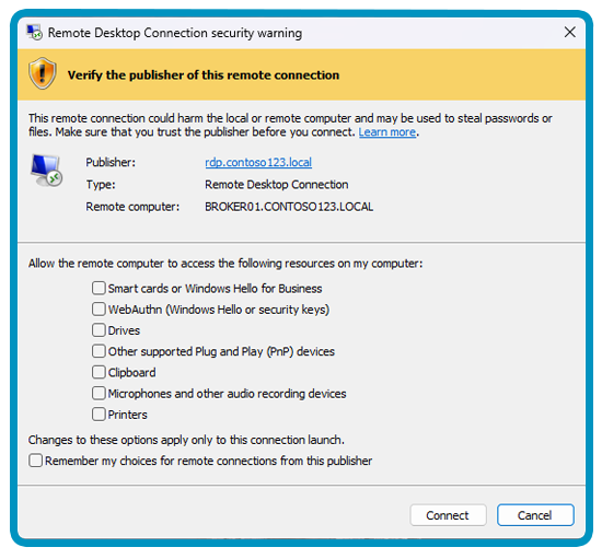 It is Microsoft’s new Remote Desktop security warning designed to show what access an RDP connection is requesting.